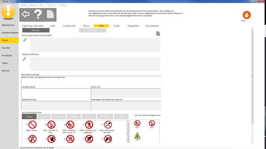 U kunt er de PBM's selecteren die noodzakelijk zijn voor de zone alsook de vereiste kwalificaties. Safetify voegt vervolgens de betrokken werknemers toe aan de lijst van de uit te delen PBM's en verifieert als ze over de benodigde kwalificaties beschikken. Voor het ingeven van de PBM's en de kwalificaties, afspraak op de overeenkomende modules (via de startpagina).